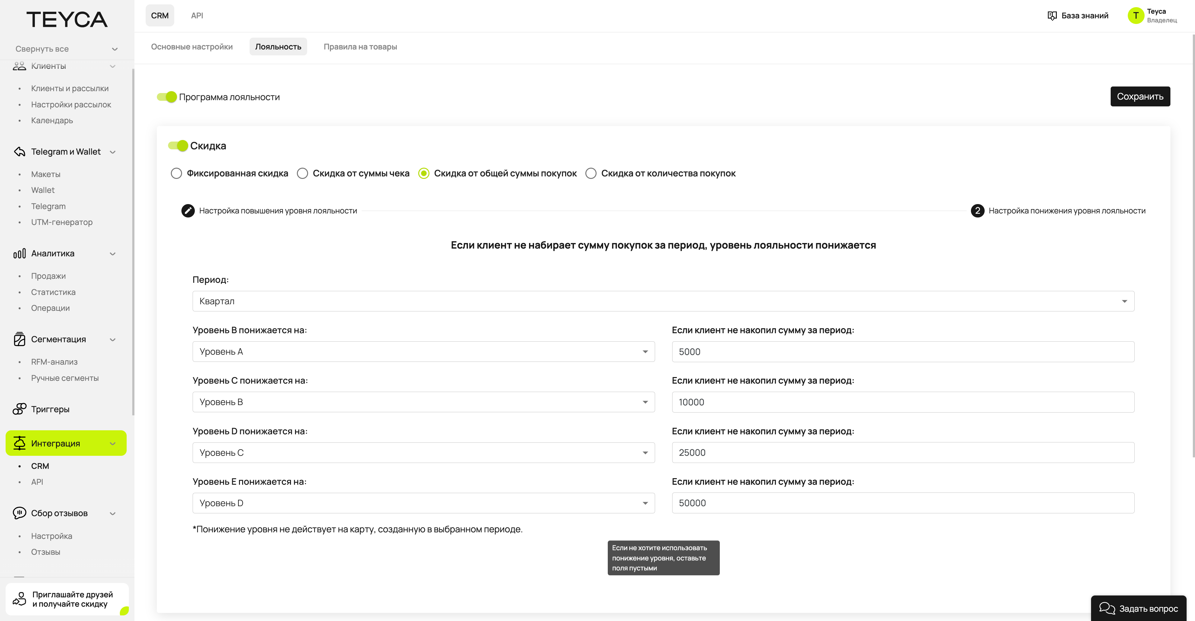 Правила понижения программы лояльности доступны только для двух типов программы лояльности: от общей суммы покупок и от количества визитов. В случае если клиент не набирает необходимую сумму покупок или визитов за период, его уровень лояльности понижается.