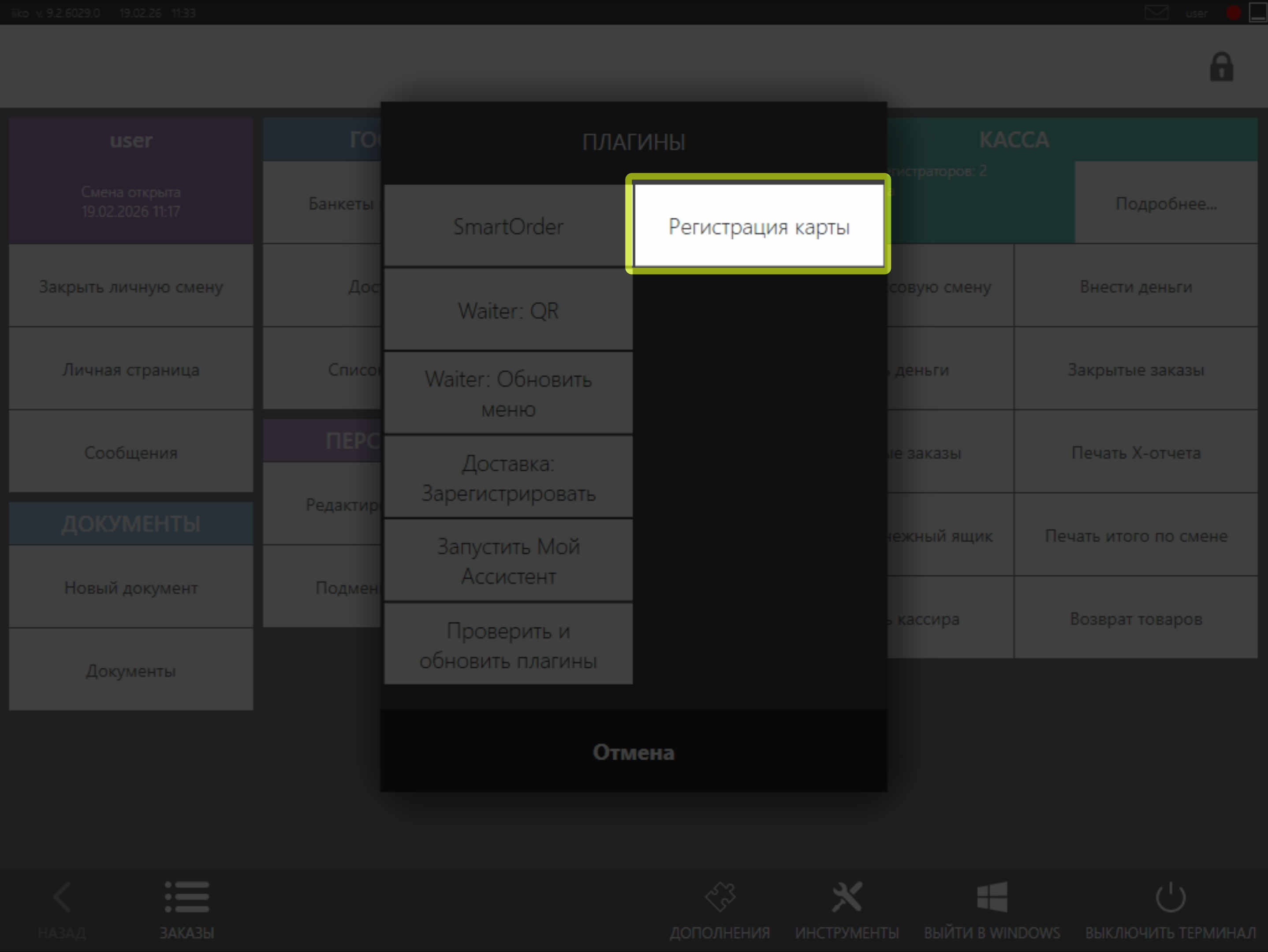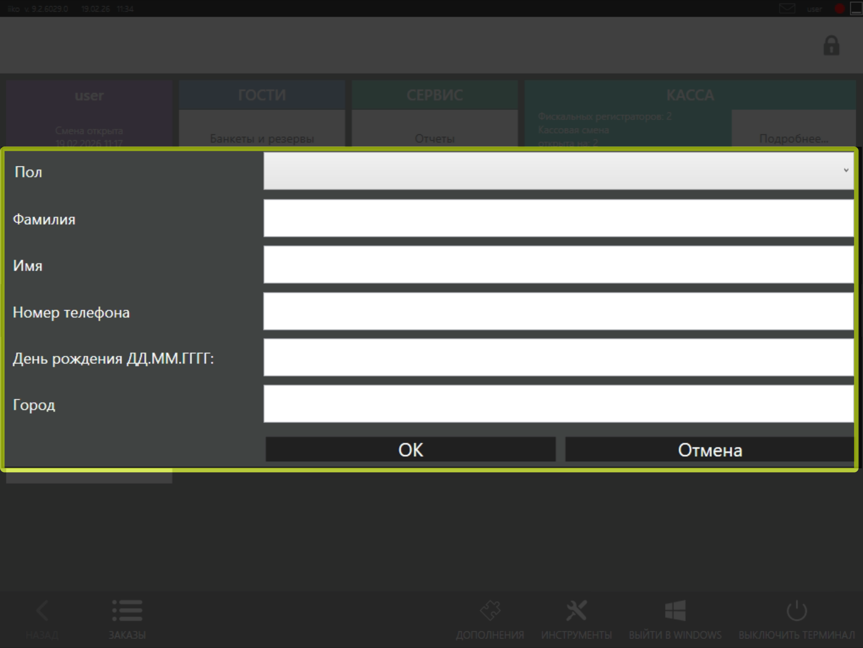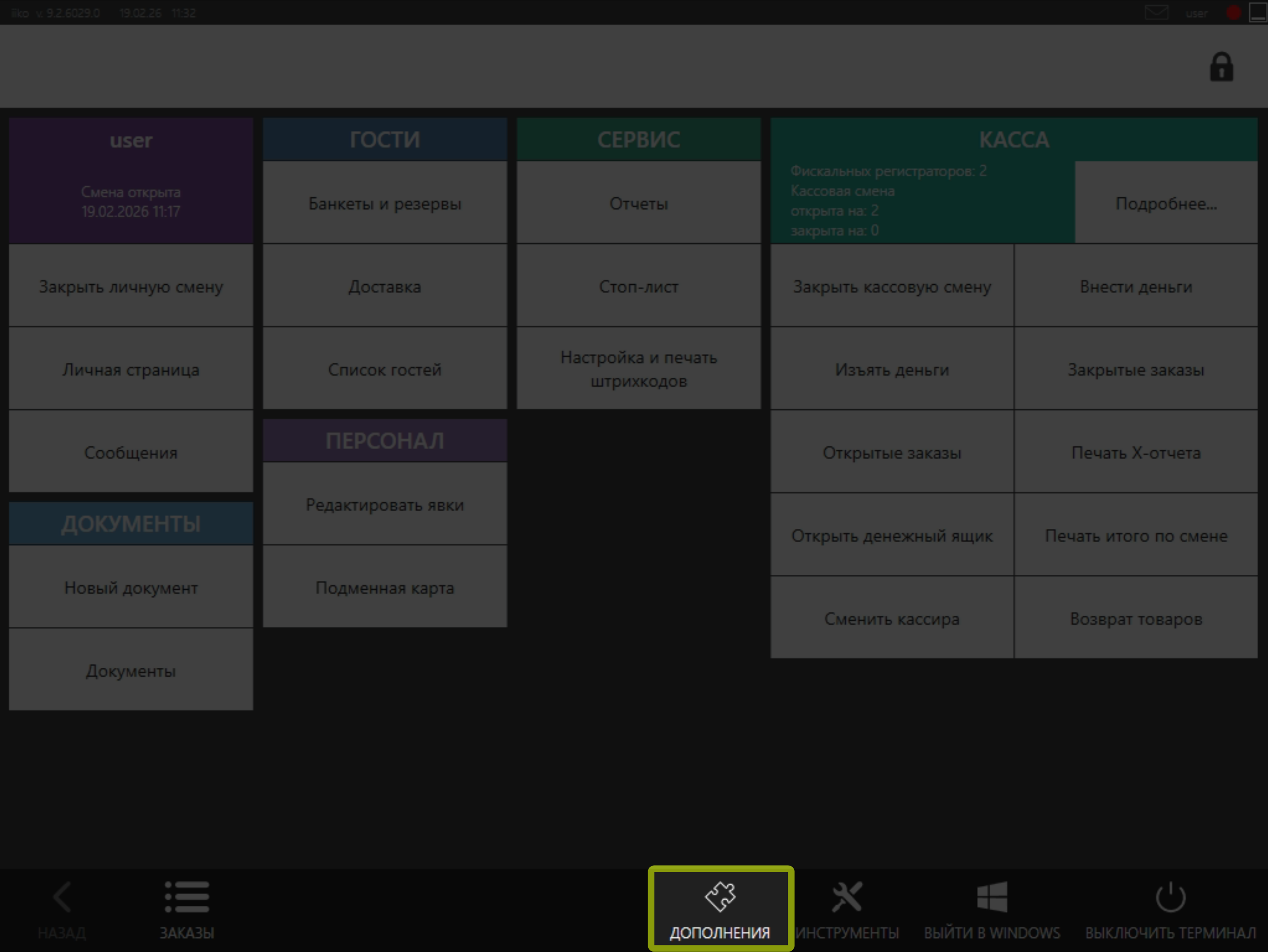 • Для того чтобы зарегистрировать клиента в системе, Вам необходимо нажать на кнопку Дополнения в нижней части главного меню iikoFront