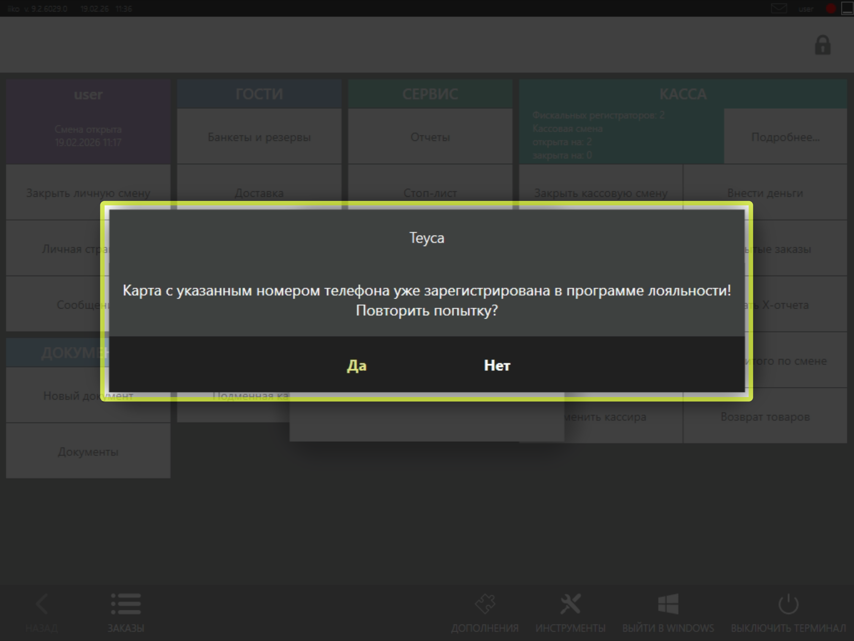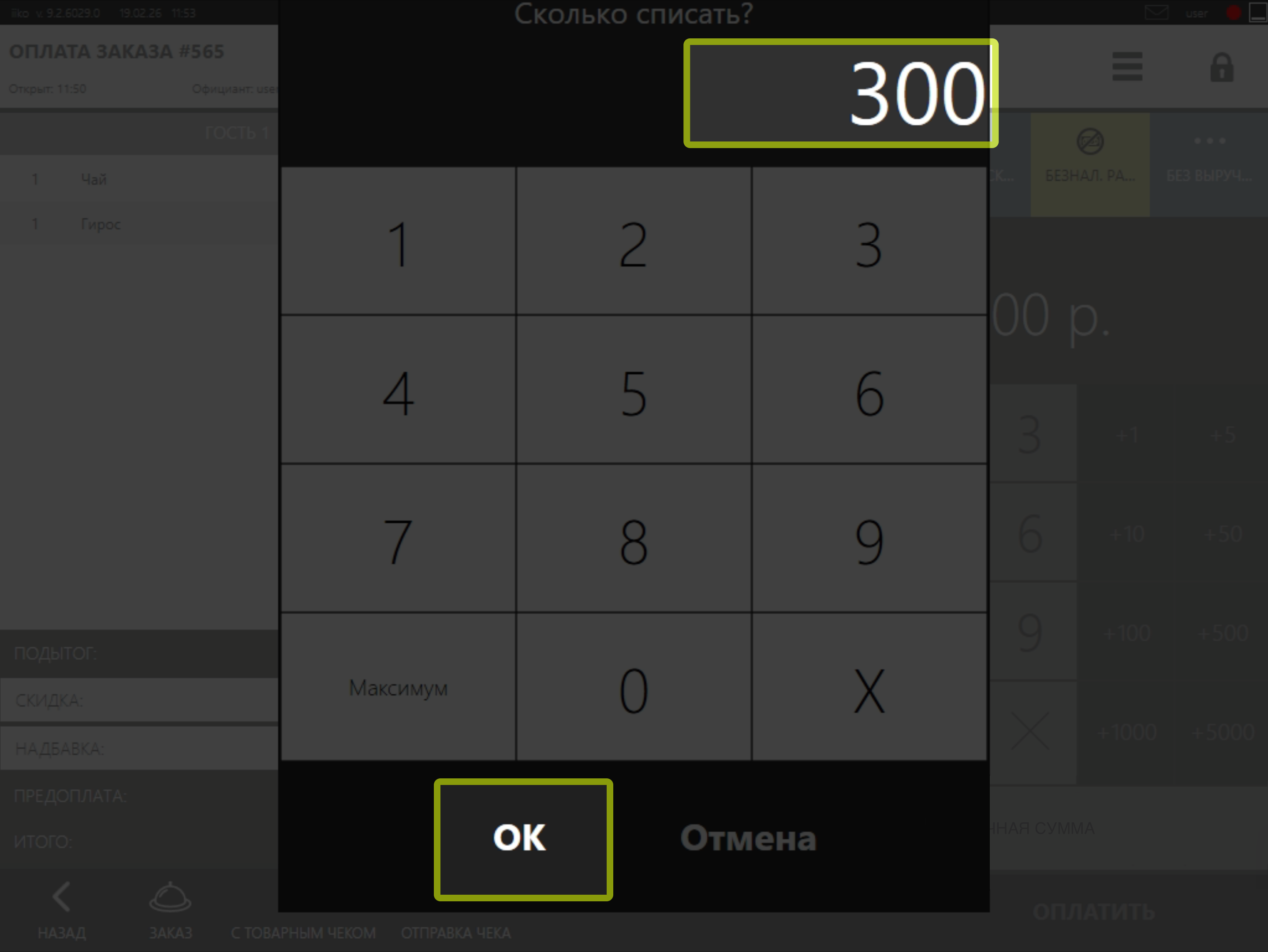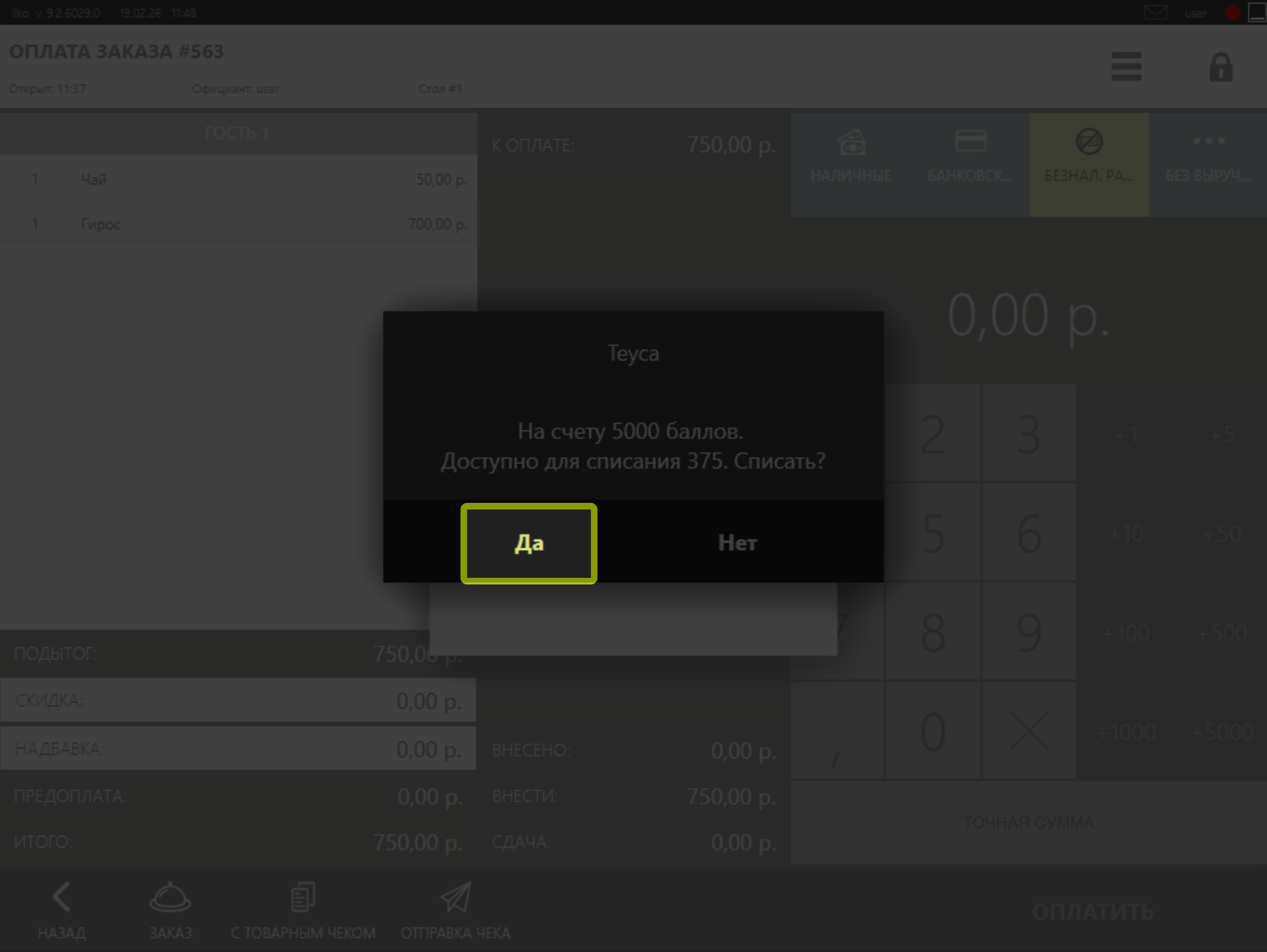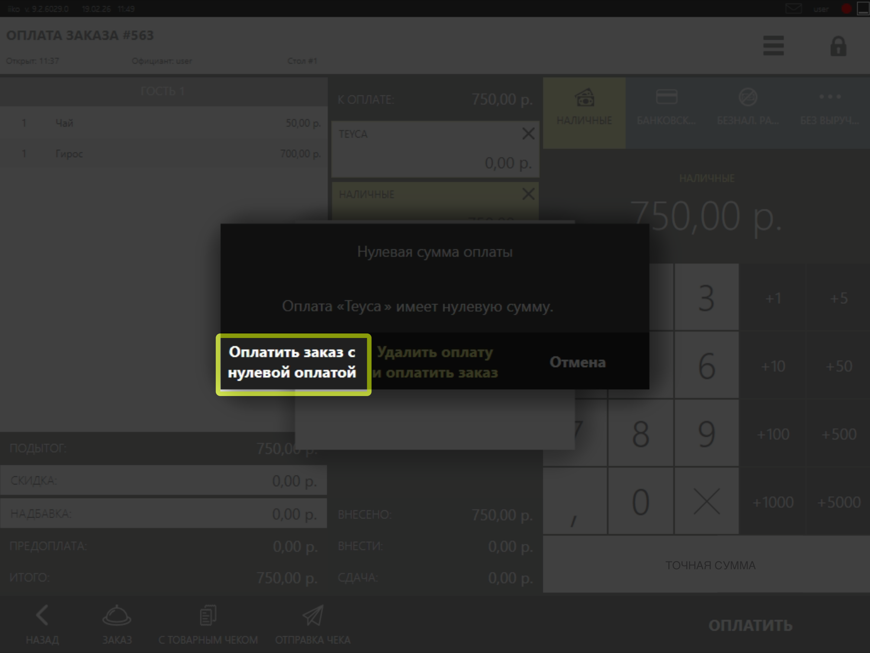 Важно! При начислении бонусов, тип оплаты Teyca равен нулю, в связи с чем iiko предлагает удалить данный тип оплаты. Для того чтобы заказ был проведен по программе лояльности, Вам необходимо выбрать вариант "Оплатить заказ с нулевой оплатой".