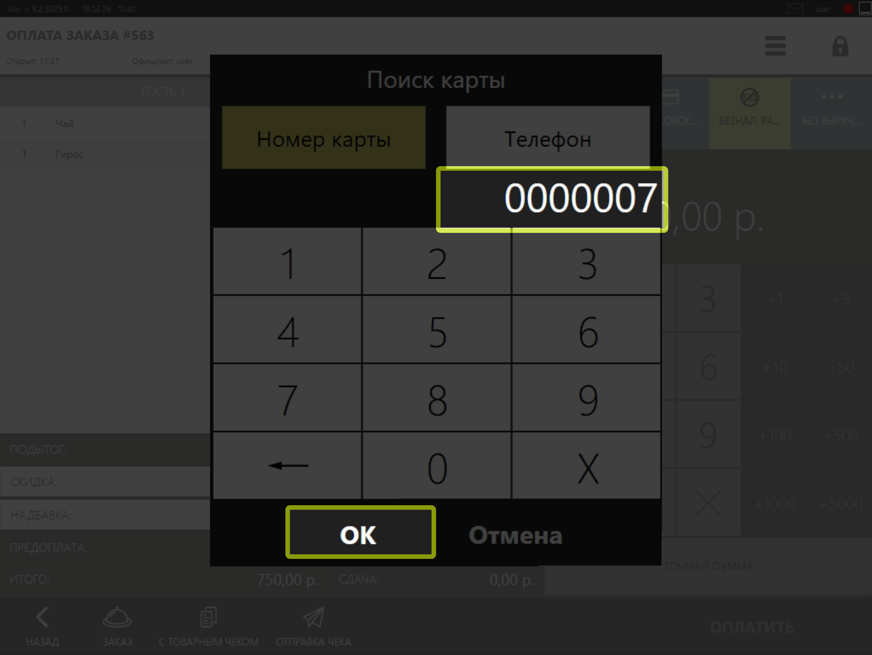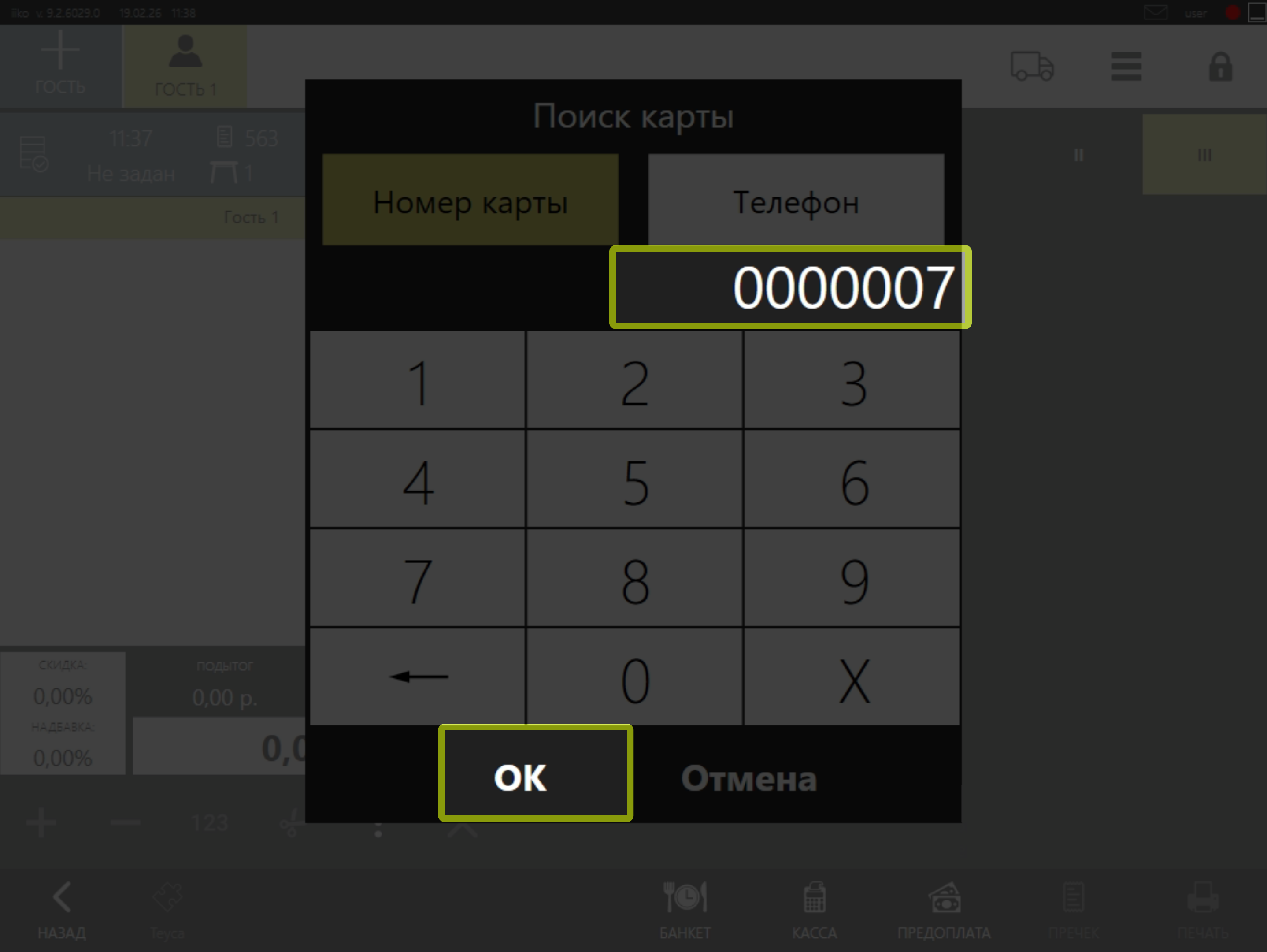 • В открывшемся окне укажите номер карты или номер телефона клиента и нажмите на кнопку ОК