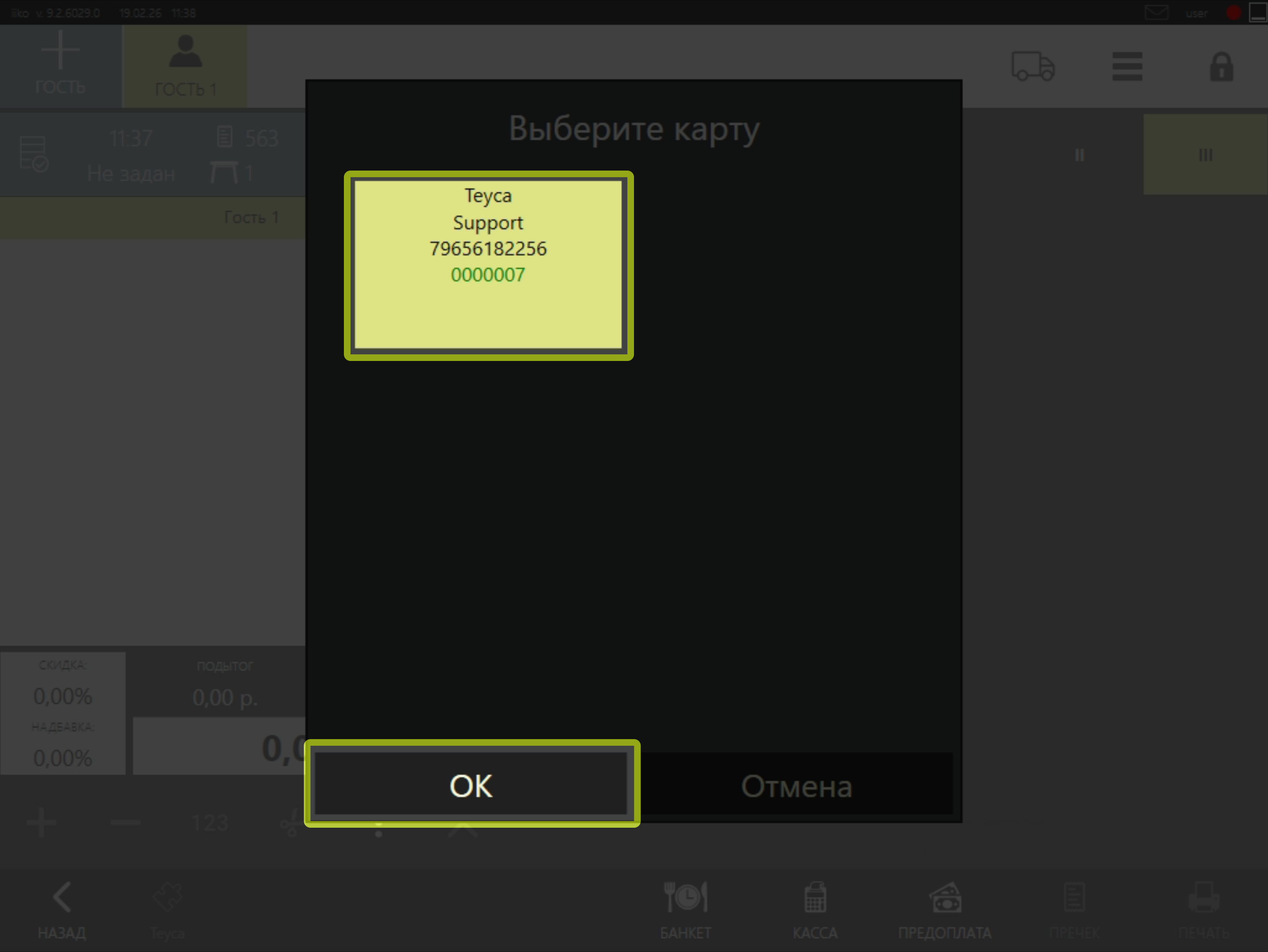Важно! Данный тип привязки карты используется только для печати пречеков с данными клиента. Для проведения операции по программе лояльности необходимо произвести привязку карты клиента в Кассе, согласно следующим инструкциям.