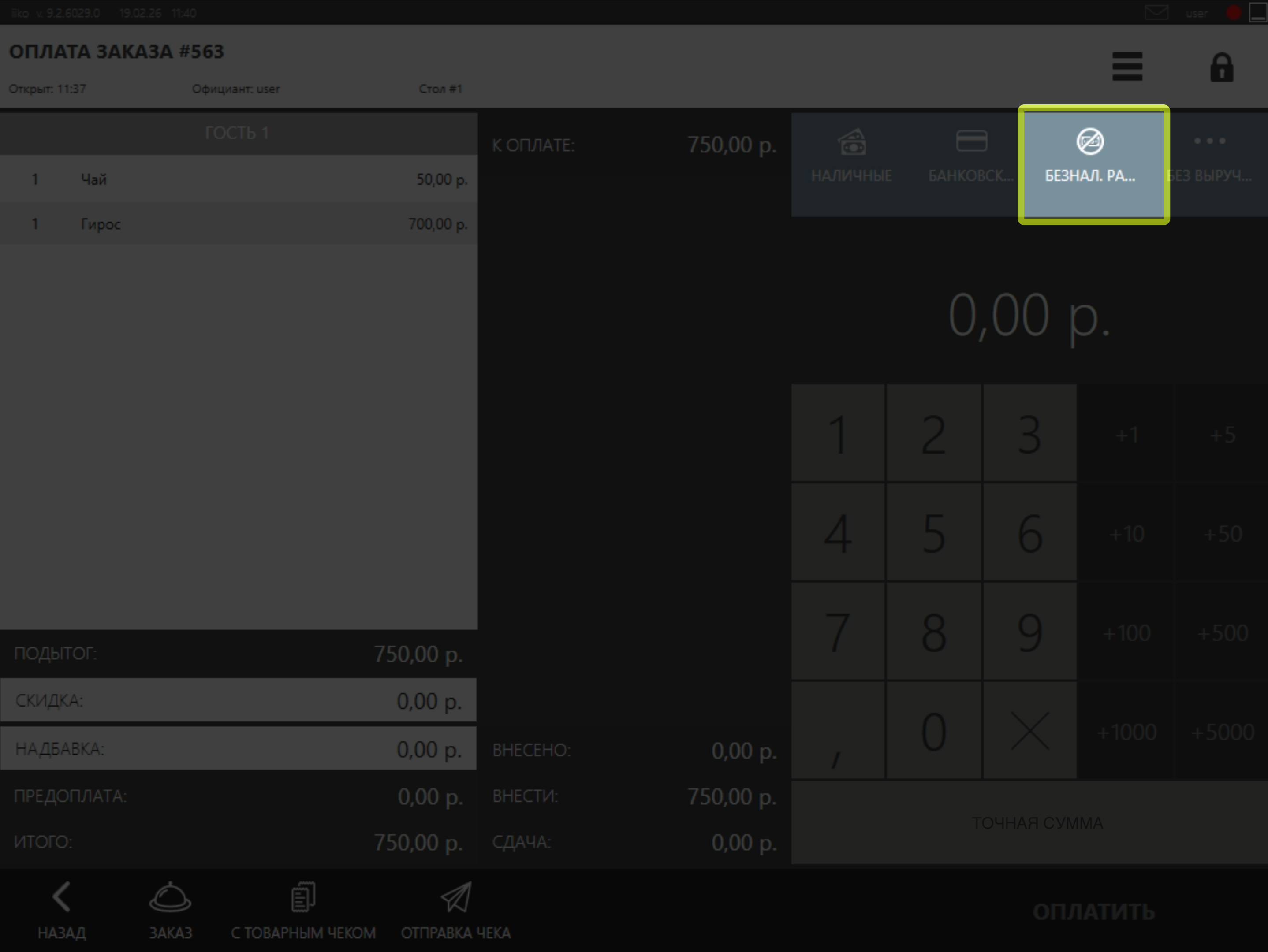 • Для применения скидки к заказу перейдите в Кассу, нажмите на кнопку Безналичный расчет и выберите тип оплаты Teyca