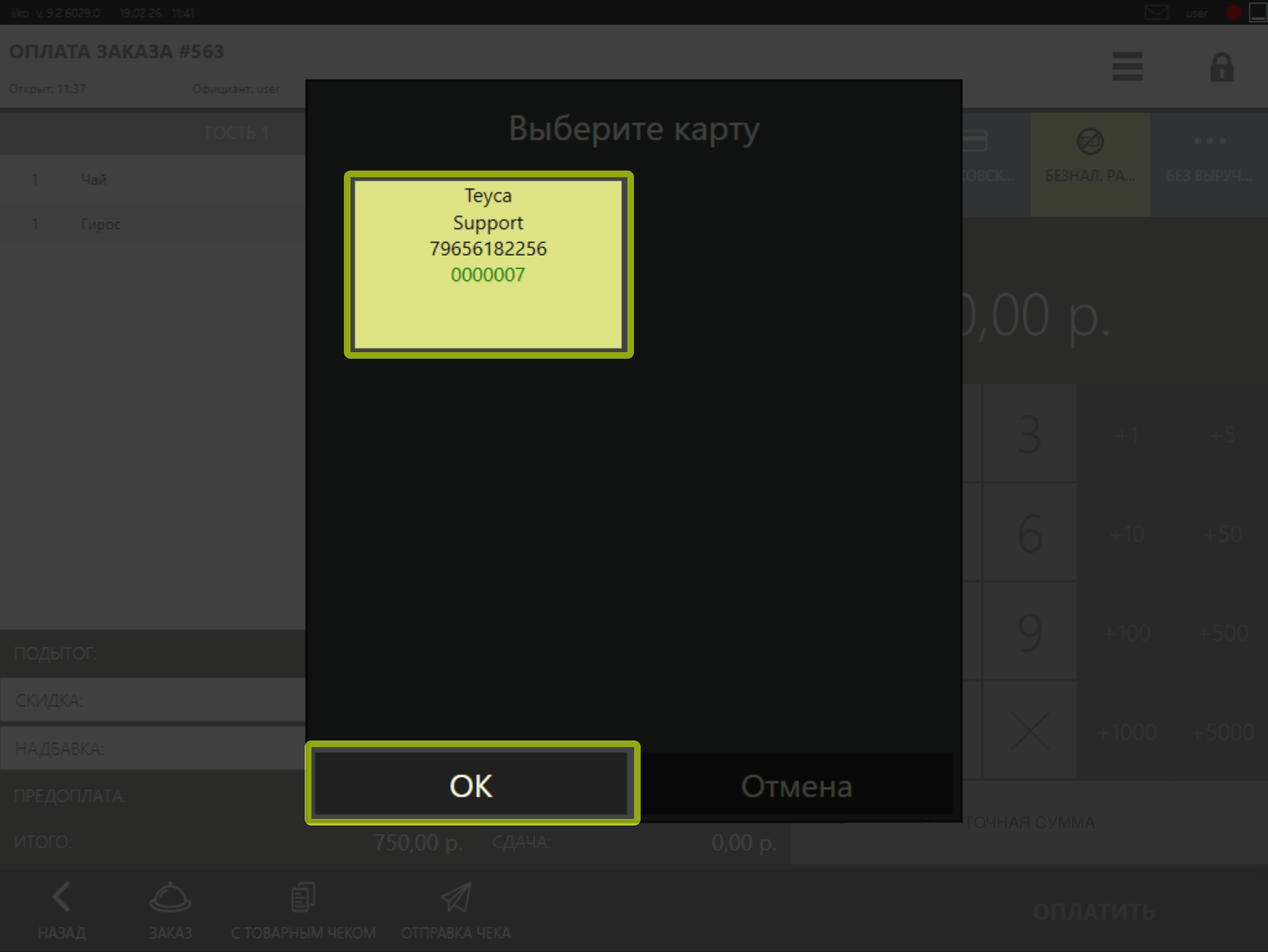 • Для того чтобы привязать карту клиента к заказу до оплаты, нажмите на кнопку Teyca в нижней части экрана