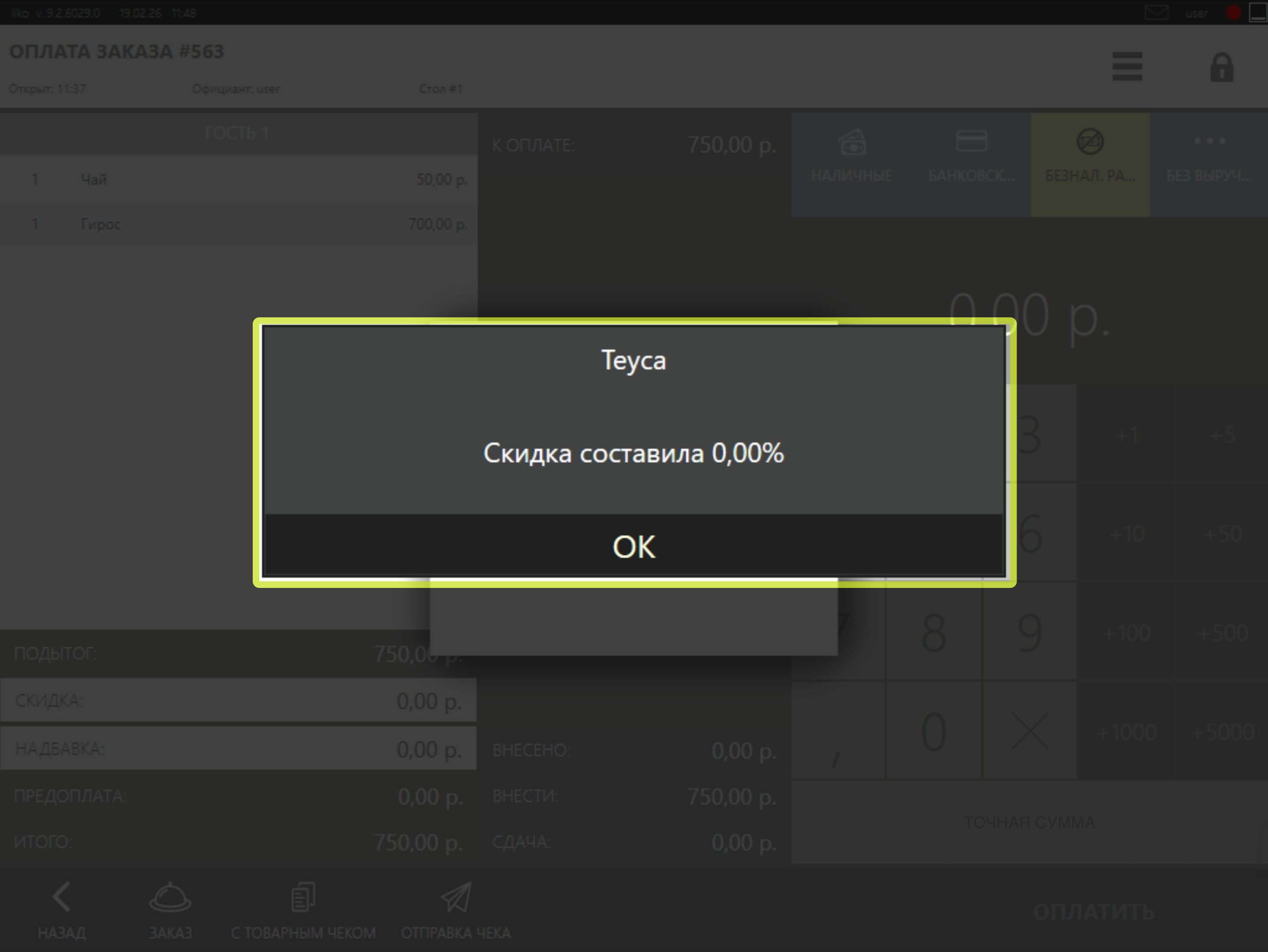 • Система отобразит нулевую скидку и добавит тип оплаты с нулевой суммой