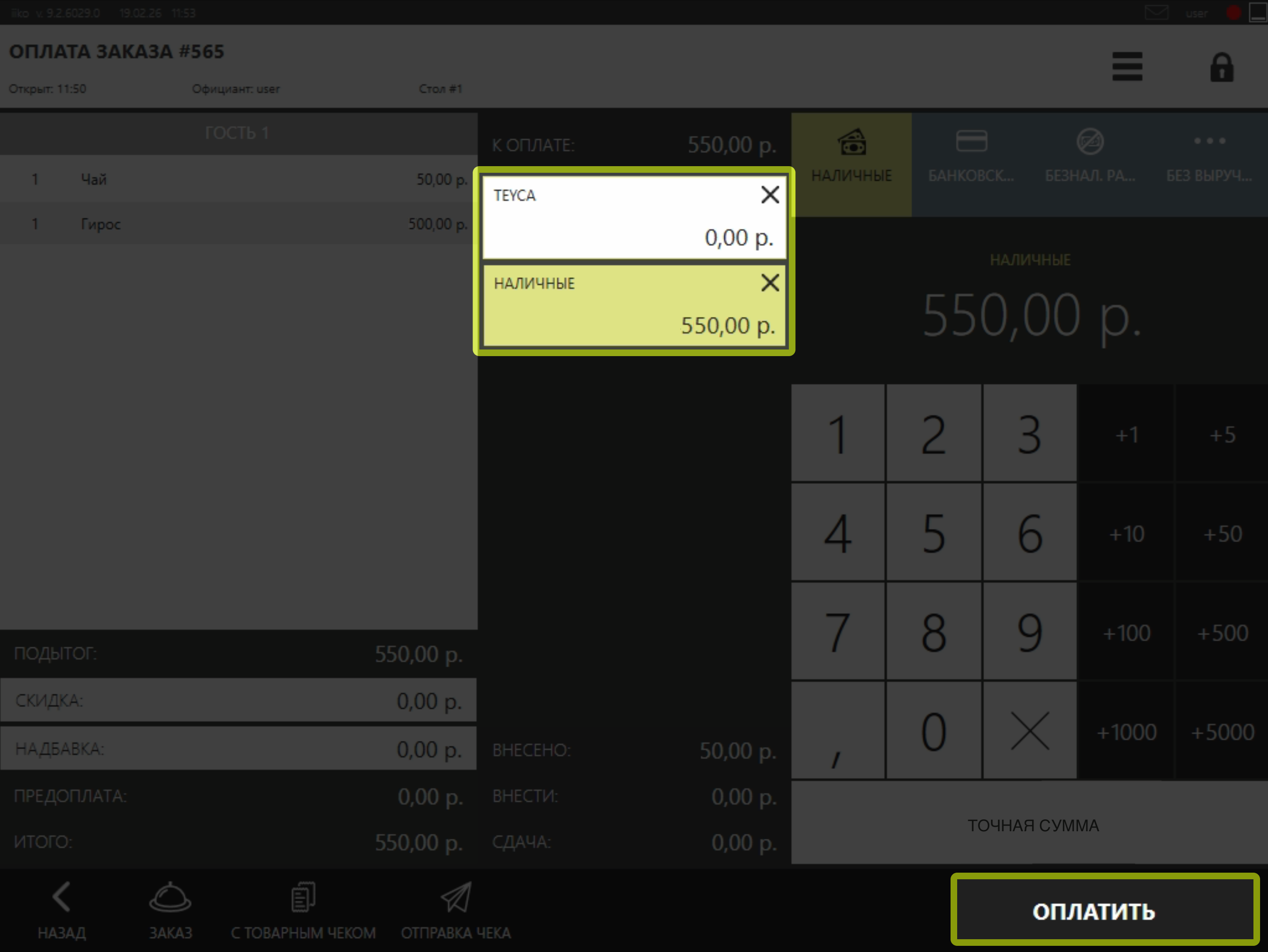 • После добавления типа оплаты Teyca проведите оплату наличными или банковской картой