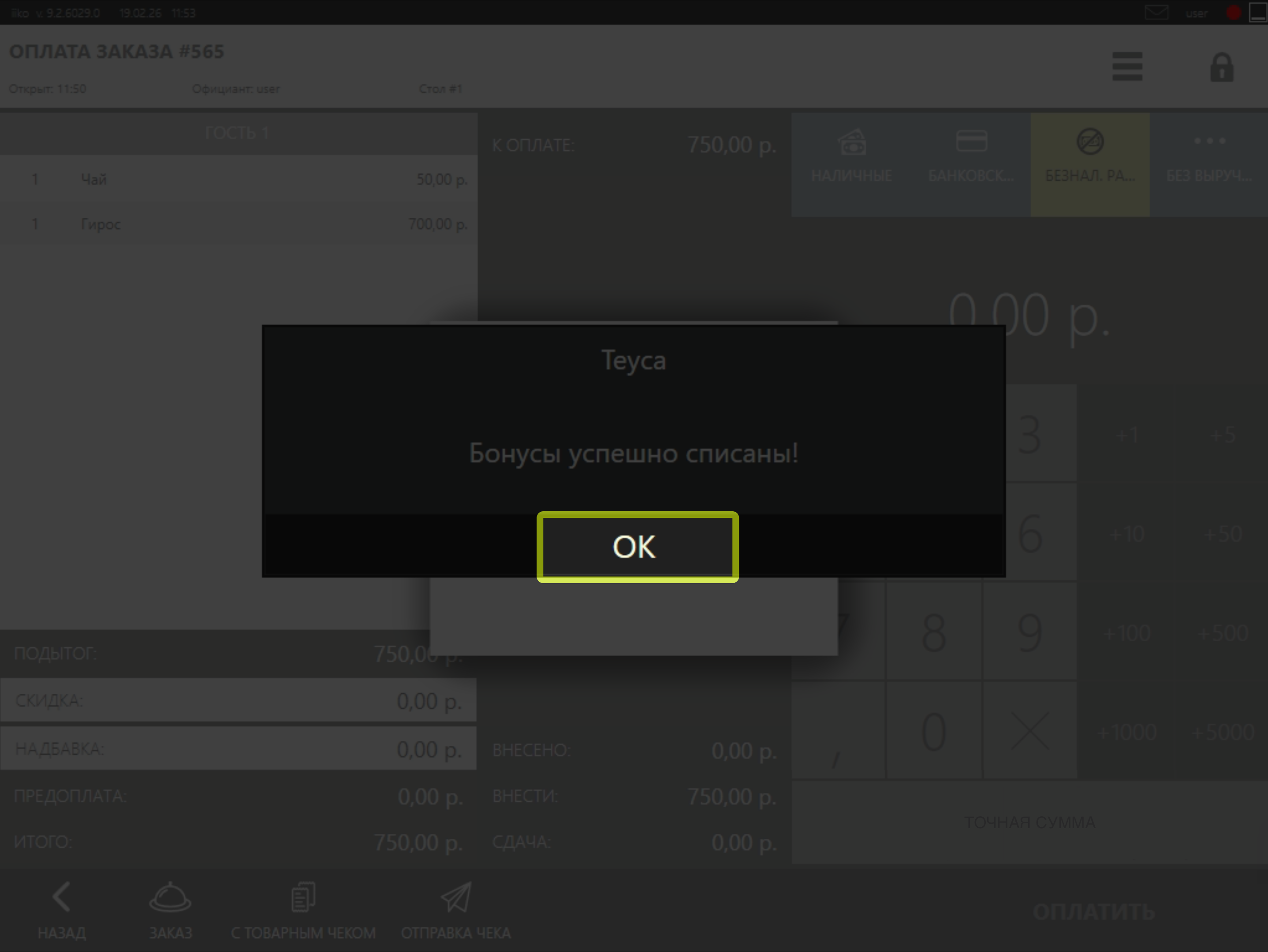 • Для списания бонусов с заказа перейдите в Кассу, нажмите на кнопку Безналичный расчет и выберите тип оплаты Teyca