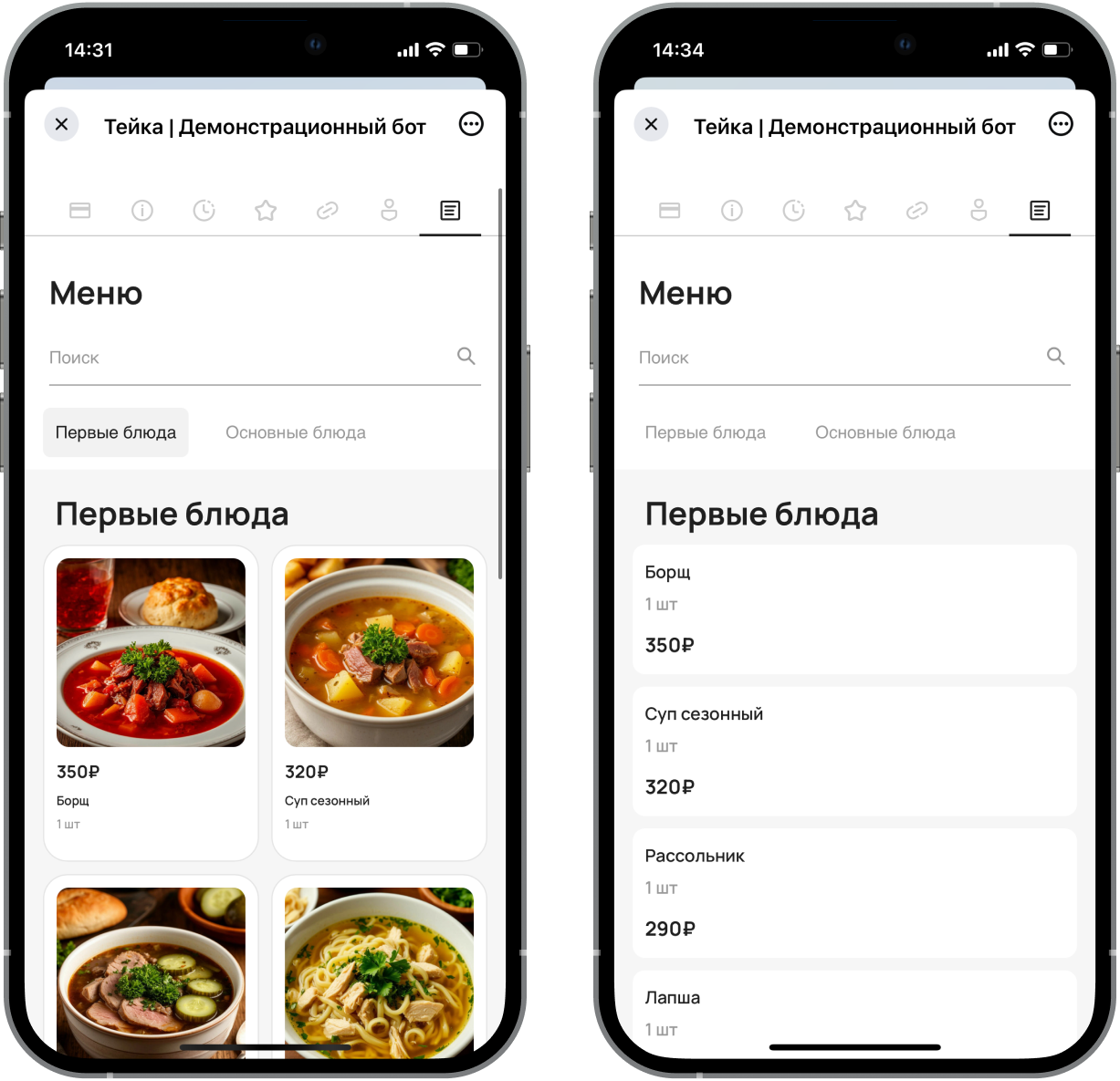 Отображать товары — выберите способ отображения товаров в меню: с фото или без фото.